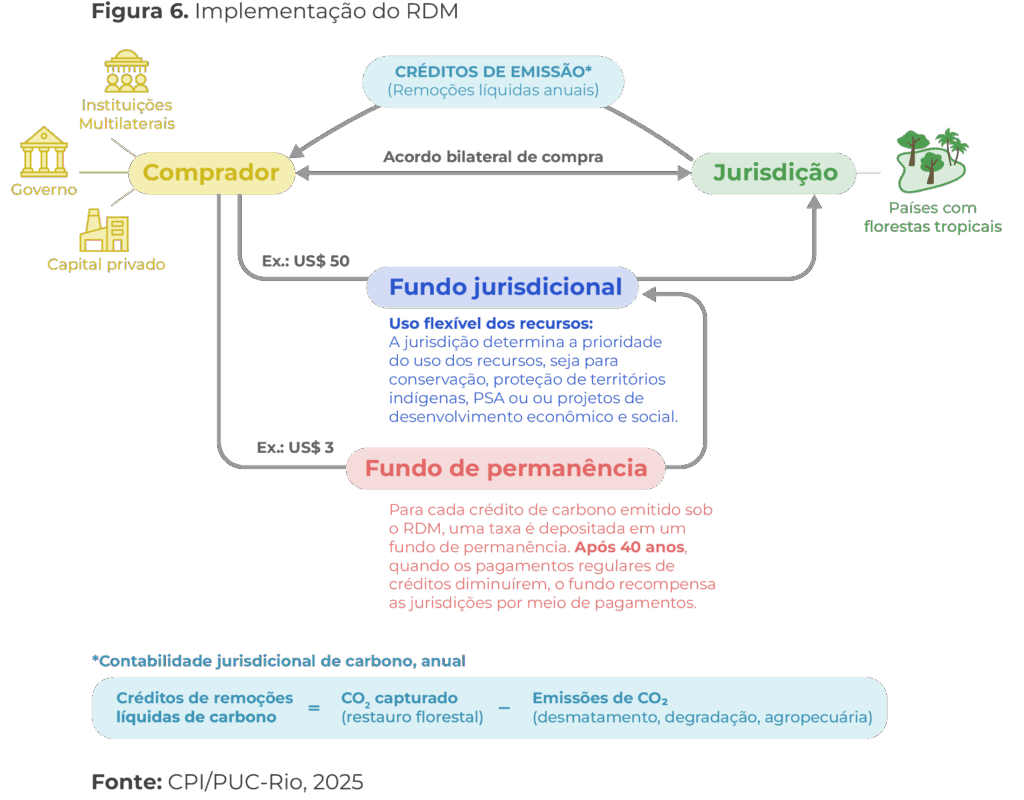 O mecanismo propõe remunerar toneladas líquidas de carbono recuperadas em áreas já desmatadas. “Na prática, governos subnacionais ou nacionais firmam acordos de venda de créditos de carbono com compradores públicos ou privados, com base em um preço previamente definido por tonelada de CO₂ removida da atmosfera”, explica o documento. O volume de créditos é calculado com base na restauração líquida, descontando eventuais emissões por novos desmatamentos.