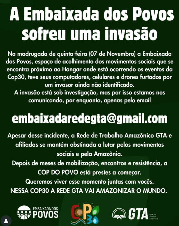 Em comunicado público, a Rede GTA informou que, temporariamente, a comunicação com o público será feita pelo e-mail embaixadaredegta@gmail.com, porque o telefone oficial também foi levado pelo suspeito. A organização destacou que os trabalhos continuam e que a programação de atividades na COP30 segue conforme o cronograma divulgado em suas plataformas digitais e no site oficial (www.redegta.org).