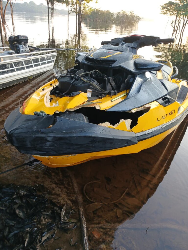 Imagens compartilhadas nas redes sociais mostram como ficou a moto aquática e o bote após a colisão. O jet ski, de cores preto e amarelo, nomeado como “Lady Kei”, teve a parte frontal danificada com o impacto. Já a embarcação, composta por alumínio, ficou danificada na parte lateral.