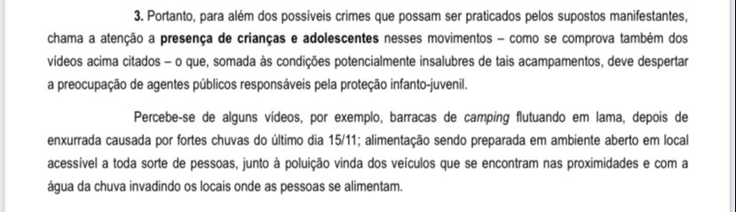“Chama a atenção a presença de crianças e adolescentes nesses movimentos, o que, somada às condições potencialmente insalubres de tais acampamentos, deve despertar a preocupação de agentes públicos responsáveis pela proteção infanto-juvenil”, destaca o ministro.