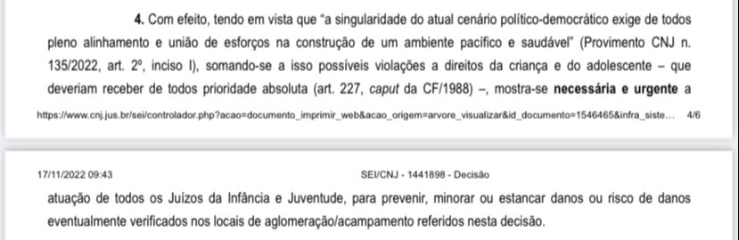 “Tendo em vista que a singularidade do atual cenário político-democrático exige de todos pleno alinhamento e união de esforços na construção de um ambiente pacífico e saudável, somando-se a isso possíveis violações a direitos da criança e do adolescente – que deveriam receber de todos prioridade absoluta (art. 227, caput da CF/1988) –, mostra-se necessária e urgente a atuação de todos os Juízos da Infância e Juventude, para prevenir, minorar ou estancar danos ou risco de danos eventualmente verificados nos locais de aglomeração/acampamento referidos nesta decisão”, aponta decisão.