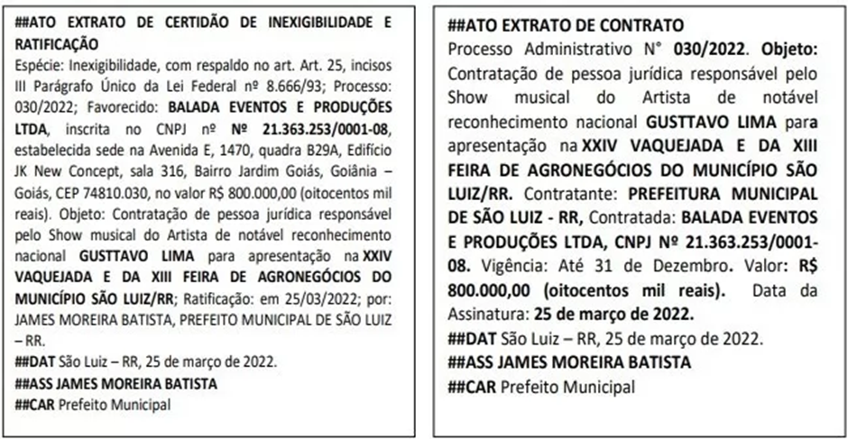 Segundo extrato divulgado pela Editais FolhaBV, a empresa Balada Eventos e Produções Ltda, responsável pela apresentação do sertanejo, foi contratada sem um processo de licitação, conforme critério da Lei Federal 8.666/1993 vigente até 31 de dezembro deste ano.