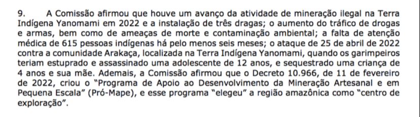 A Comissão afirmou que houve um avanço da atividade de mineração ilegal na Terra Indígena Yanomami, em 2022, e a instalação de dragas, o aumento do tráfico de drogas e armas, bem como de ameaças de morte e contaminação ambiental; a falta de atenção médica de 615 pessoas indígenas há, pelo menos, seis meses.