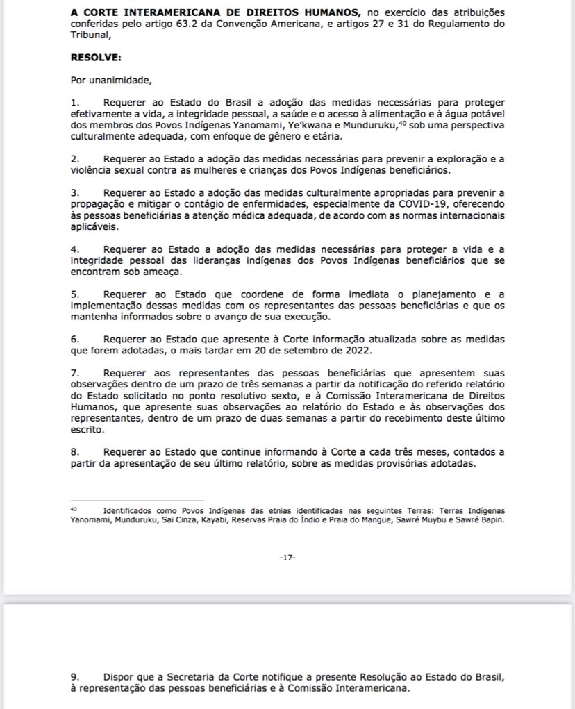 A Corte ordena ainda que o planejamento deve ser feito de forma imediata, com informes à corte sobre a execução das ações. A resolução da CIDH afirma que os povos indígenas estão sujeitos ao avanço significativo do garimpo e da mineração ilegal. Aponta que há uma continuidade de ameaças, homicídios, perseguições e casos de estupro nas comunidades. E menciona a falta de forças de segurança na região, a despeito do aumento de garimpeiros armados.
