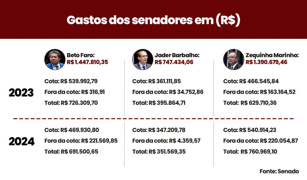 O senador Zequinha Marinho, que termina seu mandato em 2027, também apresentou aumento dos gastos de 2024 para 2023, quando utilizou R$ 466,5 mil, ante os R$ 540,9 mil do ano passado. Deste montante, R$ 138 mil foram para despesas com passagem aéreas, aquáticas e terrestres nacionais, R$ 128,2 mil para aluguel de imóveis para escritório político (são duas salas comerciais), R$ 85,1 mil para locomoção, hospedagem, alimentação e combustíveis e mais R$ 90 mil para serviços de apoio ao parlamentar.