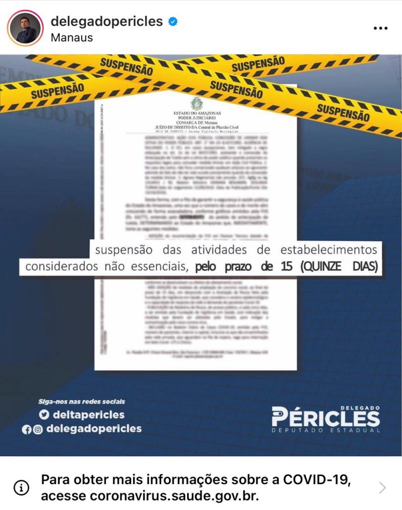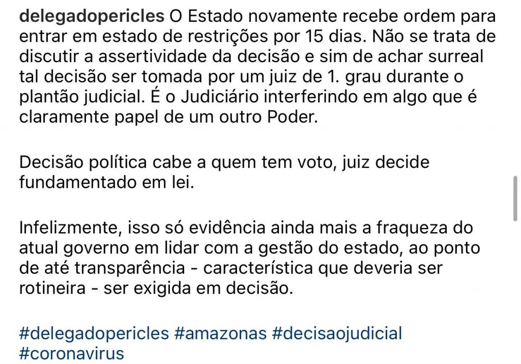 Seguindo a “ideia” do presidente, aliados de Bolsonaro, em Manaus, foram contrários ao isolamento social desde dezembro do ano passado, mesmo com alertas da Fundação de Vigilância Sanitária e da Fundação Oswaldo Cruz (Fiocruz). Entre eles, o deputado estadual do Amazonas, Delegado Péricles (PSC), que colocou em debate a decisão judicial que mandou fechar o comércio não essencial na capital amazonense.