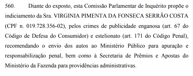 “Ao induzir em erro seus milhões de seguidores – que acreditaram que suas ‘apostas’ eram reais –, e obter vantagem indevida – em razão das apostas realizadas por parte desses seguidores, que renderam milhões a ela e às Bets que representou –, há indícios de que Virginia tenha cometido o crime de estelionato“, diz Soraya.