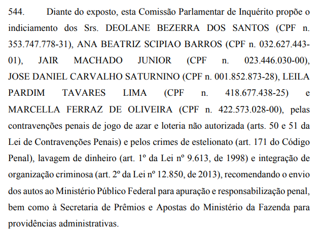 Já Deolane foi convocada pela CPI, mas recebeu um habeas corpus do ministro do Supremo Tribunal Federal (STF) André Mendonça que a liberava de ir ao Senado. Mesmo assim, a relatora afirma que a CPI “colheu indícios suficientes da prática de crimes“.