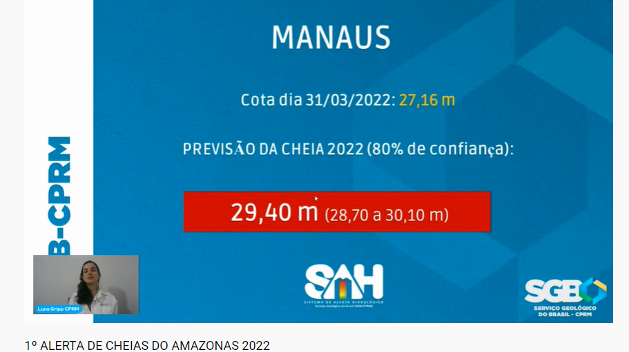 No ano passado, o nível do Rio Negro alcançou, em 16 de junho, a maior cota da história, em 118 anos de medição, ao chegar a 30,02 metros. A probabilidade de que a marca seja superada em 2022 é baixa, afirma a pesquisadora em geociências do SGB – CPRM, Luna Gripp Simões Alves.