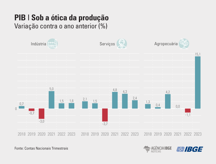 A agropecuária, serviços e indústria também foram as principais responsáveis pelo crescimento do PIB. A primeira, por exemplo, foi o setor com maior crescimento em comparação ao ano passado, com 15,1%. As indústrias ficaram responsáveis por 1,6% em relação ao ano anterior, com destaque para as indústrias extrativas, como extração de petróleo e gás natural, e de minérios de ferro.