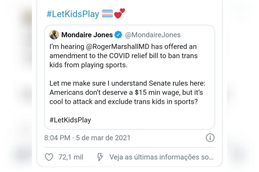 A representante da cidade de Nova York adicionou a hashtag #LetKidsPlay (deixem as crianças jogarem). Ocasio-Cortez estava tuitando uma postagem do colega democrata de Nova York Mondaire Jones: “Ouvi dizer que @RogerMarshall (senador republicano) ofereceu uma emenda ao projeto de lei de alívio da covid para proibir crianças trans de praticar esportes”, escreveu Jones.