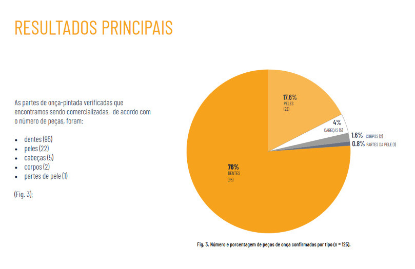 Entre as partes mais comercializadas ilegalmente estão o dente e a pele, sendo 95 publicações do primeiro e 22 do segundo. Também foram detectadas cinco peças de cabeças de onça, dois corpos inteiros e uma publicação de partes de pele.