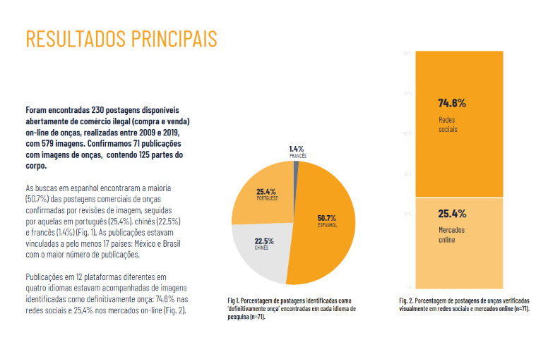 Segundo o relatório preliminar, foram detectados 21 anúncios em mercados on-line, dois em sites de busca, cinco em redes sociais, dois em sites de vídeos e um em blog. Ao todo, 579 imagens foram coletadas e em pelo menos 71 publicações foram confirmadas as imagens de onças, contendo 125 partes do corpo.