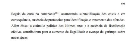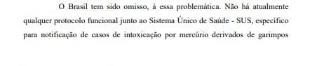 “Não há, atualmente, qualquer protocolo funcional junto ao Sistema Único de Saúde (SUS) específico para notificação de casos de intoxicação por mercúrio derivados de garimpos ilegais de ouro na Amazônia, acarretando subnotificação dos casos e, em consequência, ausência de protocolos para identificação e tratamento dos afetados. Além disso, o estímulo político dos últimos anos e a ausência de fiscalização efetiva contribuíram para o aumento da ilegalidade e avanço do garimpo sobre novas áreas”, aponta o relatório.