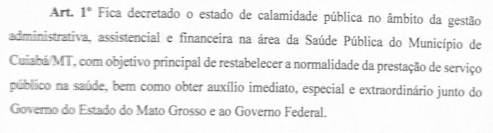 O decreto tem o propósito de obter auxílio do governo estadual e do governo federal para poder normalizar os atendimentos na área, que apresenta aumento de óbitos em unidades hospitalares. Com a medida, a pasta poderá fazer compras de serviços e insumos com a dispensa de licitação.