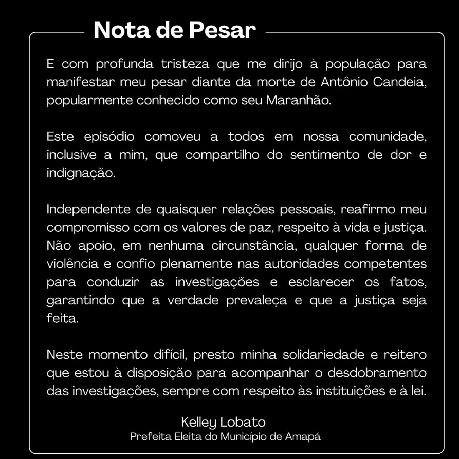 Kelly Lobato é atualmente filiada ao partido União Brasil, mas já teve passagem pelo Partido Liberal (PL). Nas redes sociais, a prefeita emitiu nota informando que “independente de quaisquer relações pessoais, reafirma seu compromisso com os valores de paz, respeito à vida e justiça”.