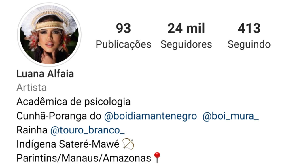 MANAUS (AM) – A estudante de psicologia e dançarina de boi-bumbá Luana Alfaia, 20, foi acusada pela Organização das Mulheres Indígenas Sateré-Mawé (Watyamã), do Amazonas, de apropriação indígena, ao não ser reconhecida como pertencente à etnia. À CENARIUM, a jovem, autodeclarada indígena Sateré-Mawé, afirmou nesta segunda-feira, 8, que considera ter sido vítima de discurso de ódio.