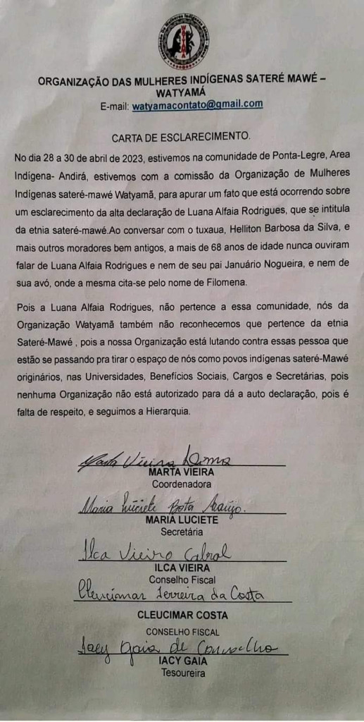 Em carta de esclarecimento, a organização Watyamã desconhece Luana Alfaia como pertencente à etnia Sateré-Mawé. O posicionamento da Watyamã foi divulgado em uma página “Sateré-Mawé”, no Facebook, que possui mais de 5 mil seguidores, na noite de domingo, 7.