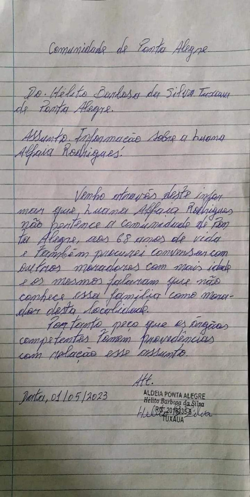 “Ao conversar com o tuxaua Helliton Barbosa da Silva, e mais outros moradores bem antigos, de 68 anos, nunca ouviram falar de Luana Alfaia Rodrigues, nem de seu pai, Januário Rodrigues, e nem de sua avó, onde a mesma cita por nome de Filomena“, diz um trecho da carta, assinada pela comissão da associação.