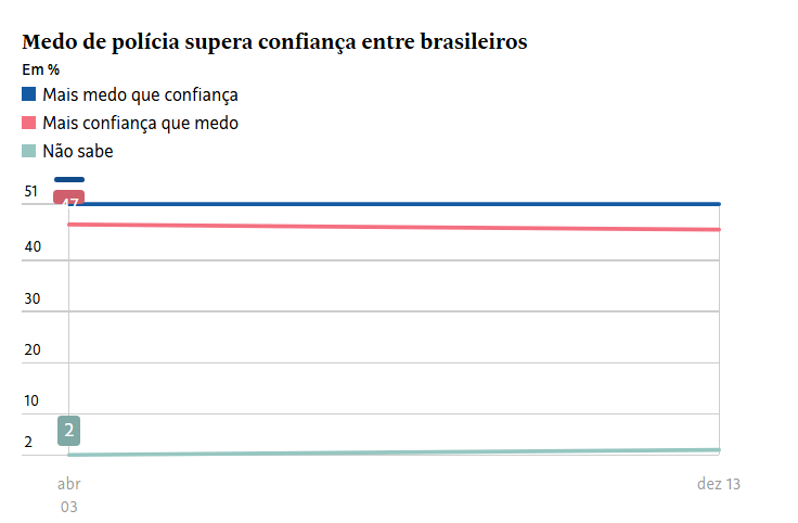 O resultado é semelhante ao aferido na pesquisa anterior em que a mesma pergunta foi feita, em abril de 2019, em meio a gestão de Jair Bolsonaro (PL). Na época, 51% afirmaram ter mais medo, enquanto 47% tinham mais confiança.