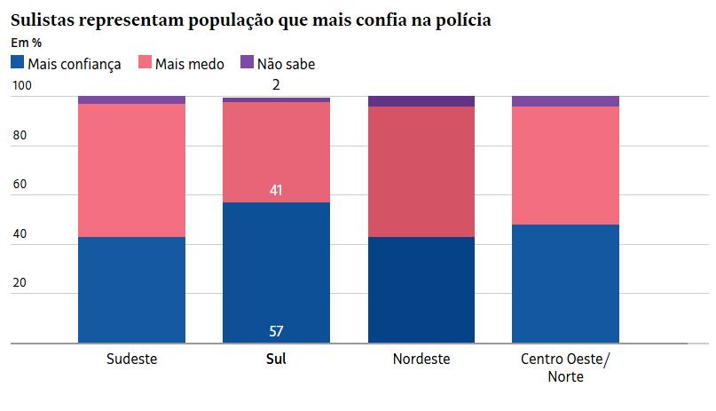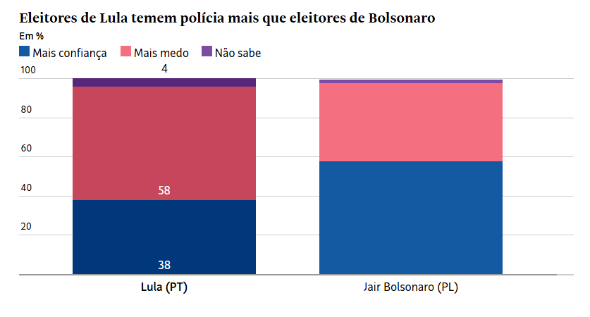 No caso de quem tem mais confiança os agentes de segurança do que medo, as taxas mais altas estão entre homens (52%, ante 40% entre as mulheres), moradores da região Sul (57%), brancos (53%, ante 38% entre os pretos), e os eleitores de Bolsonaro no 2º turno da eleição presidencial de 2022 (58%, ante 38% entre os eleitores de Lula). As margens de erro nesses segmentos variam de três a seis pontos.