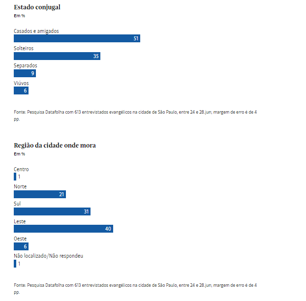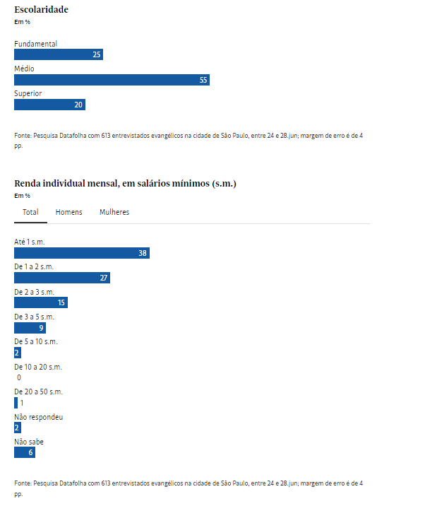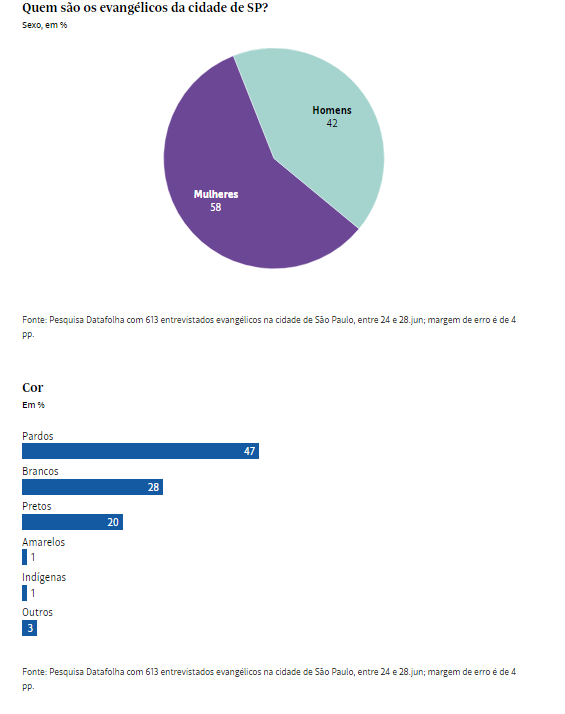 Um panorama que pouco tem a ver com o imaginário alimentado por quem acompanha a distância a expansão evangélica na cidade. A tentação de associá-la a pastores ricos, quase sempre brancos e donos de impérios religiosos é forte, mas não espelha o retrato traçado por pesquisa Datafolha realizada entre 24 e 28 de junho com 613 moradores da capital paulista que se declaram parte desse ramo cristão.
