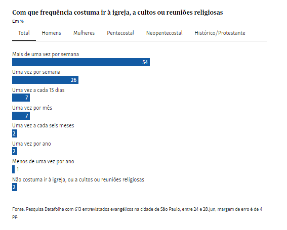 A assiduidade realça o alto engajamento dos fiéis: 54% vão a cultos mais de uma vez por semana, e 26%, pelo menos uma vez.