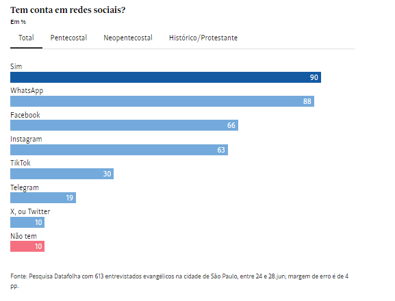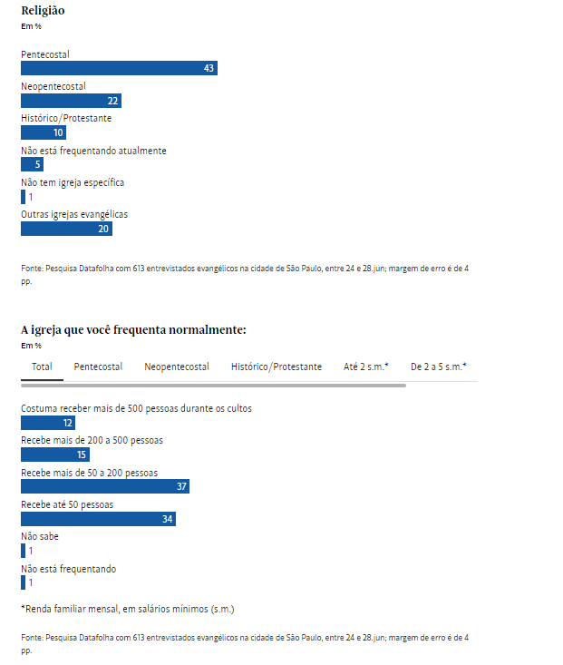 As igrejas históricas, que incluem batistas e presbiterianas, são 10%. Já os desigrejados —quem hoje se reconhece evangélico, mas não frequenta uma igreja— respondem por 5% da amostra.