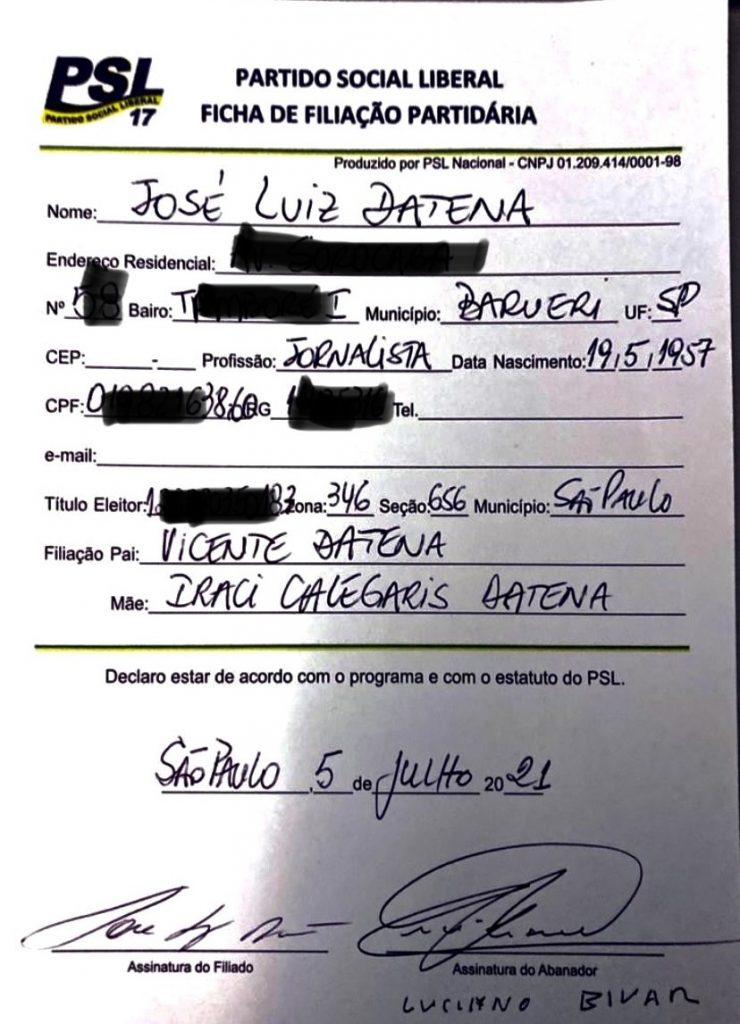 MANAUS – O apresentador José Luiz Datena assinou, nesta segunda-feira, sua ficha de filiação ao PSL. O próximo passo da sigla é lançá-lo como pré-candidato à Presidência da República em 2022.