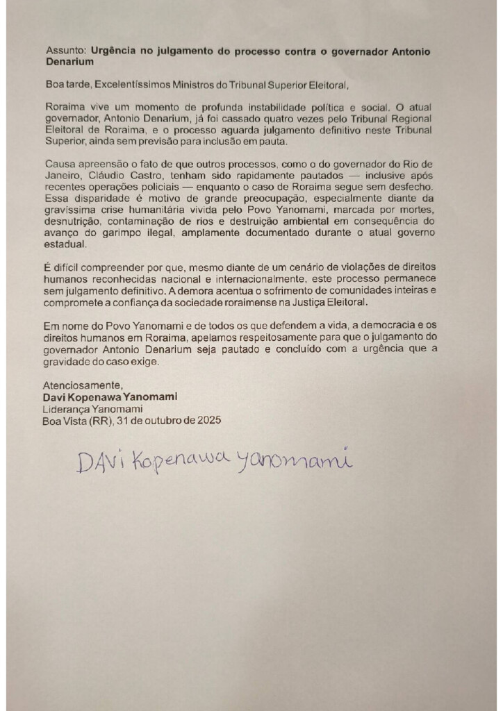 Na carta, Kopenawa questiona a demora do julgamento e compara a lentidão do processo de Denarium com a celeridade de outros casos, como o do governador do Rio de Janeiro, Cláudio Castro (PL-RJ), julgado pela Corte na terça-feira, 4. “Causa apreensão o fato de que outros processos […] tenham sido rapidamente pautados, enquanto o caso de Roraima segue sem desfecho. Essa disparidade é motivo de grande preocupação”, diz um trecho da carta.