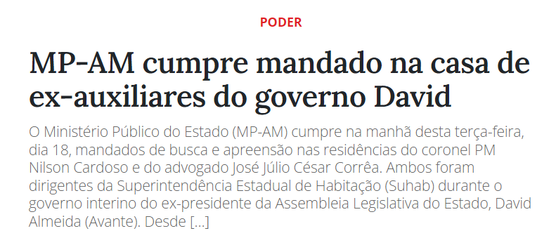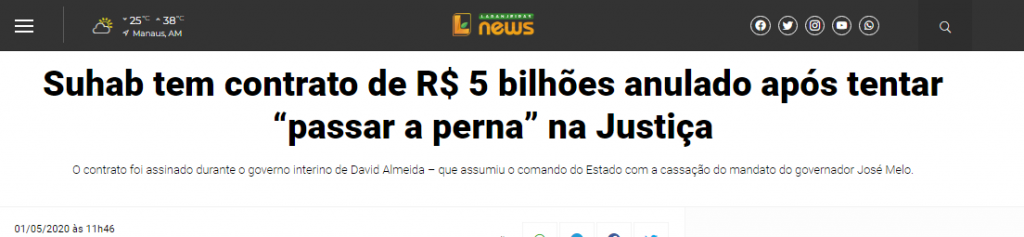 O Diário Oficial do Estado (DOE) publicou o contrato bilionário, no dia 4 de outubro de 2017, último dia de David Almeida como governador “tampão”, cargo que assumiu com a cassação de José Melo (Pros), de quem foi líder na Assembleia Legislativa do Amazonas (Aleam). O aliado de David Almeida foi preso por corrupção no âmbito da Operação Maus Caminhos, que investigou o desvio de R$ 100 milhões da Saúde do Estado.