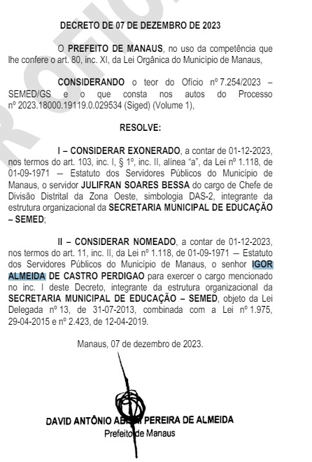 MANAUS (AM) – A Prefeitura de Manaus, sob a gestão de David Almeida (Avante), usa recursos federais do Fundo de Manutenção e Desenvolvimento da Educação Básica e de Valorização dos Profissionais da Educação (Fundeb) para pagar um salário de R$ 6 mil ao vice-presidente do Jovem Avante Amazonas e pré-candidato a vereador pelo município de Itacoatiara (a 276 quilômetros de Manaus), Igor Almeida de Castro Perdigão, nomeado em cargo comissionado da Secretaria Municipal de Educação da capital (Semed). Igor Almeida diz atuar na Secretaria Municipal de Segurança Pública e Defesa Social (Semseg).