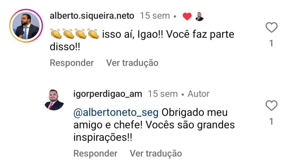 Ao publicar ações da Prefeitura de Manaus, o vice-presidente do Jovem Avante publica cita conteúdos envolvendo a Segurança Pública Municipal e chama o titular da Semseg, Alberto de Siqueira Santos Barbosa Neto, de “meu chefe”. Procurado, o chefe de gabinete de Alberto de Siqueira, Regilany Brandão, confirmou que o dirigente do Jovem Avante atua na secretaria como “assessor”. Ele não deu outros detalhes.