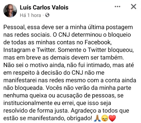 “Pessoal, essa deve ser a minha última postagem nas redes sociais. O CNJ determinou o bloqueio de todas as minhas contas no Facebook, Instagram e Twitter. Somente o Twitter bloqueou, mas em breve as demais devem ser também. Não sei o motivo ainda, não fui intimado, mas até em respeito à decisão do CNJ não me manifestarei nas redes, mesmo com a conta ainda não bloqueada. Vocês não verão da minha parte nenhuma queixa ou acusação de pessoas, se institucionalmente eu errei, que isso seja resolvido de forma justa. Agradeço a todos que estão se manifestando, obrigado!