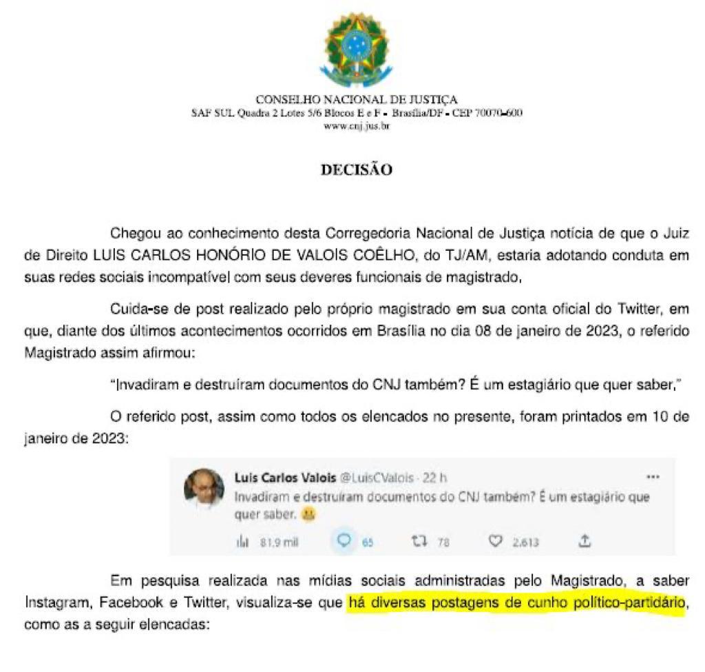 “Chegou ao conhecimento desta Corregedoria Nacional de Justiça a notícia de que o juiz de Direito Luis Carlos Honório de Valois Coêlho, do TJ/AM, estaria adotando conduta, em suas redes sociais, incompatível com seus deveres funcionais de magistrado (…) Cuida-se de post realizado pelo próprio magistrado, em sua conta oficial do Twitter, em que, diante dos últimos acontecimentos ocorridos em Brasília, no dia 8 de janeiro de 2023, o referido magistrado afirmou assim: