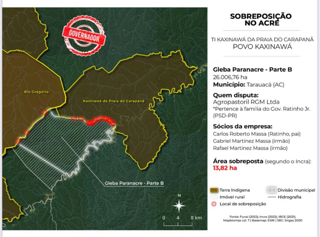 Os imóveis, segundo o relatório, estão registrados em nome da Agropecuária RGM, uma sociedade entre Ratinho e seus filhos, e se sobrepõem à Terra Indígena Kaxinawá da Praia do Carapanã, regularizada desde 2001.