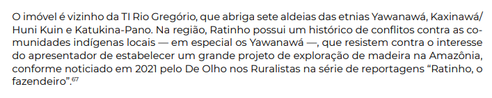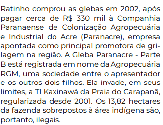 O relatório cita dezenas de políticos e financiadores com propriedades incidentes em áreas oficialmente reconhecidas como territórios originários. No caso de Ratinho, o dossiê detalha que as fazendas no município de Tarauacá foram adquiridas em 2002 junto à Companhia Paranaense de Colonização Agropecuária e Industrial do Acre (Paranacre), empresa citada como promotora de grilagem fundiária na região.