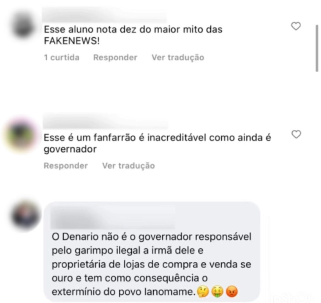 Os seguidores do político também comentaram a publicação, expressando sua indignação. “Esse é um fanfarrão. É inacreditável como ainda é governador” e “esse aluno é nota dez do maior mito das Fake News”. Outro questionou se o governador não era responsável pelo garimpo ilegal.