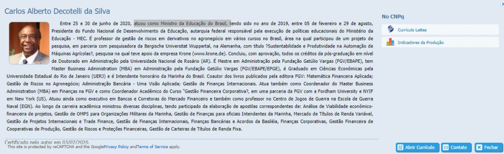 Conforme noticiou o Metrópoles, o ex-ministro menciona o período que “esteve” no Ministério da Educação (MEC). “Entre 25 e 30 de junho de 2020, atuou como Ministro da Educação do Brasil”, escreveu ele, na plataforma do Conselho Nacional de Desenvolvimento Científico e Tecnológico (CNPq)