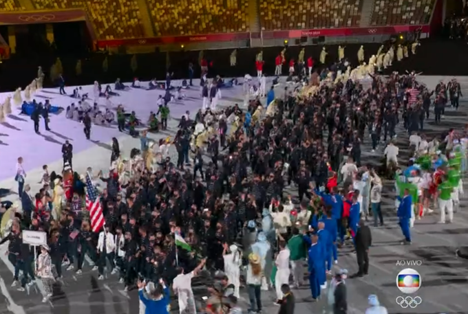 Assim como a presença de aglomerações e o não respeito ao distanciamento social, o uso da máscara não esteve presente o tempo todo. Os atletas do Tajiquistão e do Quirguistão, por exemplo, entraram na cerimônia sem o equipamento, que, em tese, faz parte do protocolo sanitário dos Jogos de Tóquio. Ao todo, segundo a organização das Olímpiadas, foram 5.700 atletas espalhados entre os 206 países.