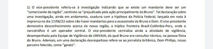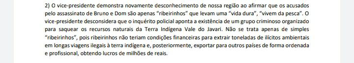 “O vice-presidente demonstra, novamente, desconhecimento de nossa região ao afirmar que os acusados pelo assassinato de Bruno e Dom são apenas “ribeirinhos” que levam uma “vida dura”, “vivem da pesca”. Não se trata apenas de simples “ribeirinhos”, pois, ribeirinhos não teriam condições financeiras para extrair toneladas de ilícitos ambientais, em longas viagens ilegais à terra indígena, e, posteriormente, exportar para outros países de forma ordenada e profissional, obtendo lucros de milhões de reais”, destaca.