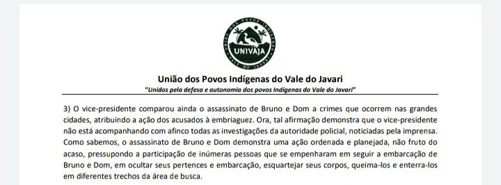 “Ora, tal afirmação demonstra que o vice-presidente não está acompanhando com afinco todas as investigações da autoridade policial noticiadas pela imprensa. Como sabemos, o assassinato de Bruno e Dom demonstra uma ação ordenada e planejada, não fruto do acaso, pressupondo a participação de inúmeras pessoas que se empenharam em seguir a embarcação de Bruno e Dom, em ocultar seus pertences e embarcação, esquartejar seus corpos, queimá-los e enterrá-los em diferentes trechos da área de busca”, contesta a Univaja que exige “o aprofundamento das investigações, considerando os documentos produzidos e compartilhados pelo movimento indígena, com as autoridades, desde 2021”, finaliza a nota.