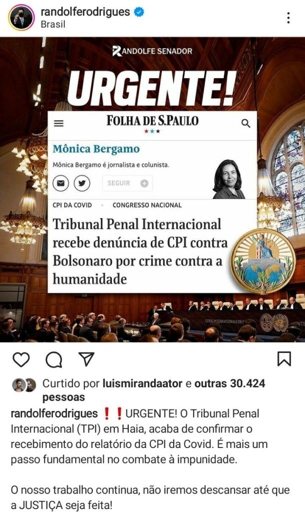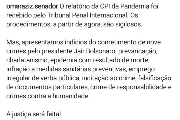 O presidente da CPI da Covid-19, senador amazonense Omar Aziz, confirmou que o relatório final foi aceito pelo Tribunal Penal Internacional e destacou que a partir de agora os procedimentos são sigilosos. “Mas apresentamos indícios de cometimento de nove crimes pelo presidente Jair Bolsonaro”, afirmou Aziz em uma rede social.