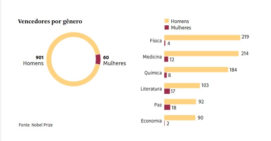 Já de cara, o Nobel de Medicina deste ano ficou com a cientista Katalin Karikó, que dividiu o prêmio com o pesquisador Drew Weissman. No dia seguinte, a láurea de Física foi para Anne L’Huillier, que dividiu o prêmio com dois homens, Ferenc Krausz e Pierre Agostini. Poucos dias depois foi a vez de o Nobel da Paz ir para a ativista iraniana Narges Mohammadi.