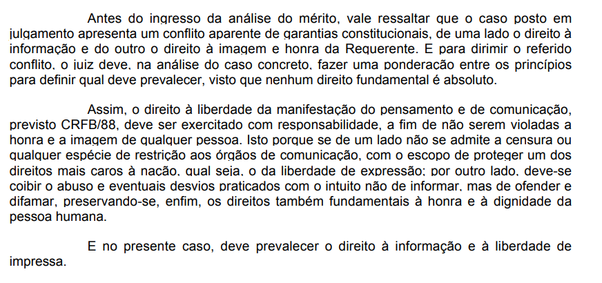 Segundo a sentença assinada pela juíza Maria do Perpétuo Socorro da Silva Menezes, a matéria não pode ser considerada de forma alguma falaciosa ou vexatória, como alegou a deputada, mas sim um exercício regular de direito por parte do meio de comunicação.