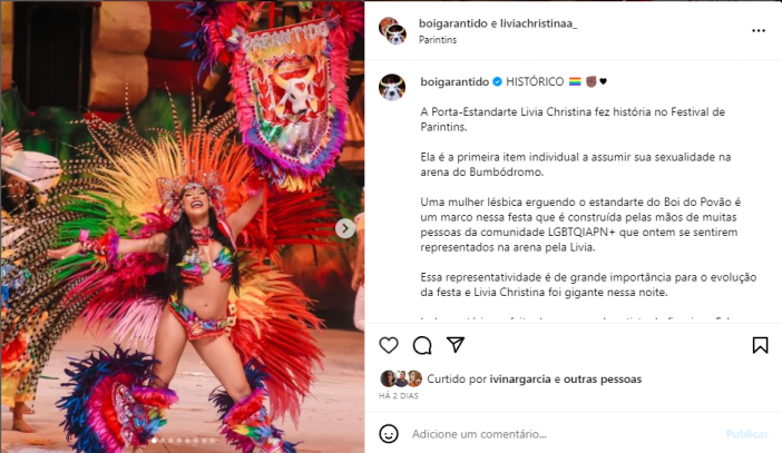 “As manifestações da cultura popular refletem os anseios das suas comunidades de referência. Os elementos que permanecem ou que perdem espaço são aqueles que são aceitos ou não pelas comunidades“, afirma. “O Boi de Parintins emerge de comunidades formadas por negros, indígenas, LGBTQIAP+, mulheres e outros grupos sociais. Logo, as apresentações naturalmente visibilizam essas pessoas, seus anseios e lutas. A cultura popular não é festa pela festa, mas verdadeiros ensaios para uma sociedade mais justa e de paz“.