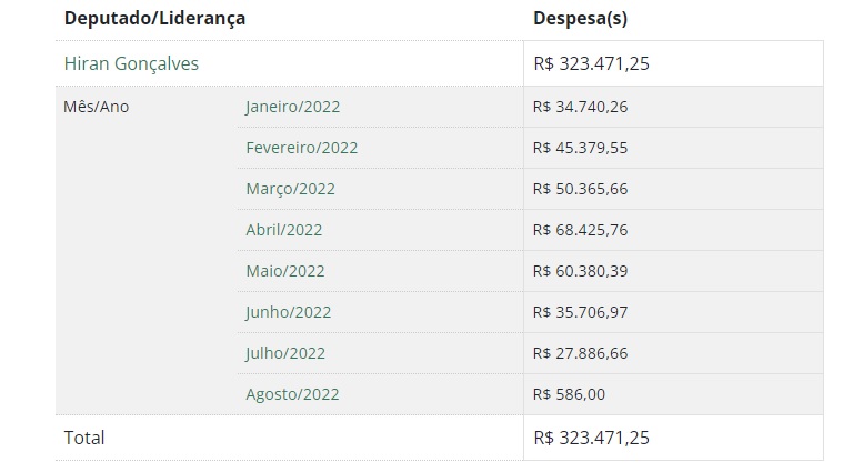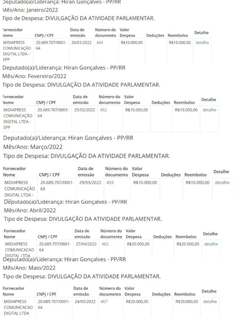 Hiran Gonçalves faz parte da aliança do atual governador de Roraima, Antônio Denarium (Progressistas), e tenta pela segunda vez uma vaga ao Senado. Segundo os dados de janeiro a maio, os gastos com a divulgação da atividade parlamentar chegaram a R$ 115 mil. Dessa verba, boa parte foi paga à empresa Midiapress Comunicação Digital LTDA. -EPP. Em quatro meses, de janeiro a maio, a empresa recebeu R$ 70 mil do deputado federal.