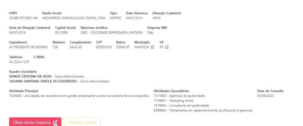 Uma consulta rápida feita no sistema da Receita Federal, a Midiapress Comunicação Digital é de propriedade de Denise Cristina da Silva e de Juliana Santana Tavela de Figueiredo. A empresa tem como sede a cidade de Maringá, no Paraná. A empresa foi aberta, em 2014, e tem como atividade principal: atividades de consultoria em gestão empresarial, exceto consultoria técnica especifica.