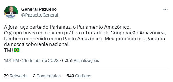 Pazuello, que é deputado federal pelo Rio de Janeiro, Estado fora da Amazônia Legal, anunciou a integração junto ao Parlamaz por meio do twitter. “Agora faço parte do Parlamaz, o Parlamento Amazônico. O grupo busca colocar em prática o Tratado de Cooperação Amazônica, também conhecido como Pacto Amazônico. Meu propósito é a garantia da nossa soberania nacional”, publicou.