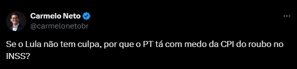 Nas redes sociais, o parlamentar perguntou de Lula nas redes sociais: “Se o Lula não tem culpa, por que tá com medo da CPI do roubo do INSS?”. A postagem já conta com quase 10 mil visualizações nas redes sociais.